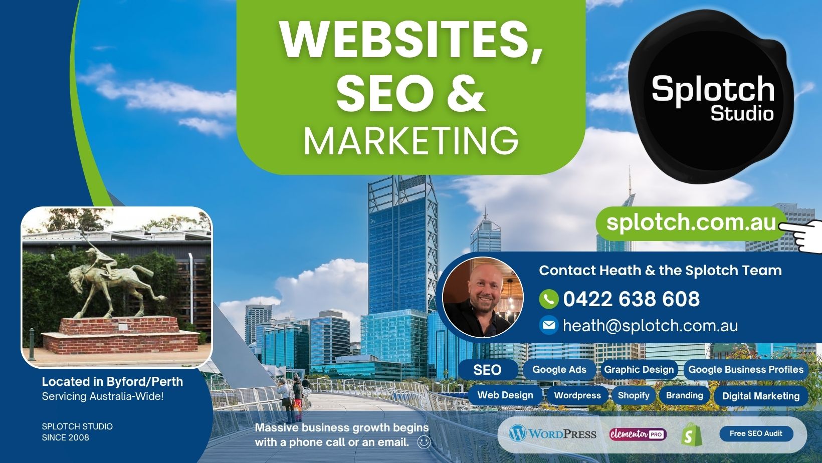 Founded by Heath Sikkema in 2008, Splotch Studio is dedicated to providing professional websites, SEO, Google Ads management, Graphic design, logos, digital marketing strategies and solutions. Located in the heart of Byford, Splotch Studio is a small enough to care and big enough to do something about it.