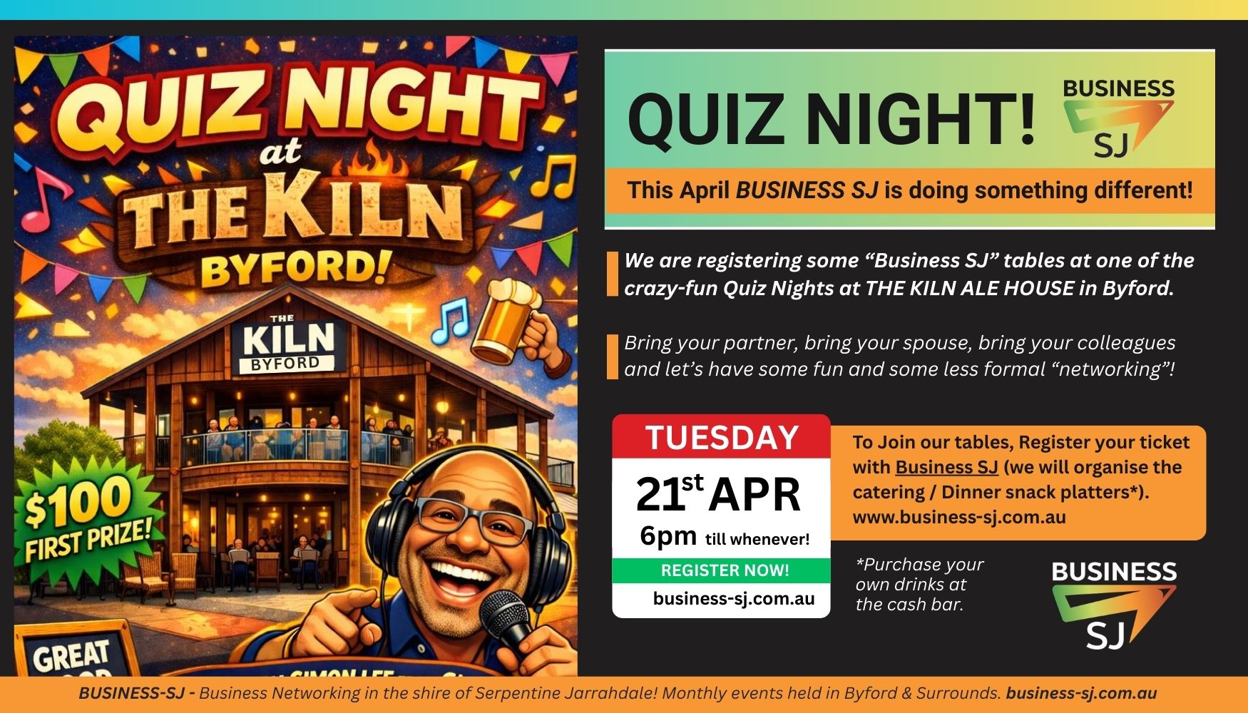 We are registering some “Business SJ” tables at one of the crazy-fun Quiz Nights at THE KILN ALE HOUSE in Byford.